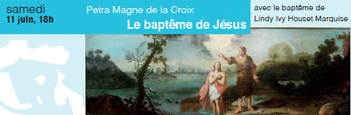 - Le samedi 11 juin à 18h : autour du baptême de Jésus – Petra Magne de la Croix. Durant ce culte aura lieu le baptême de Lindy Ivy Houset Marquise