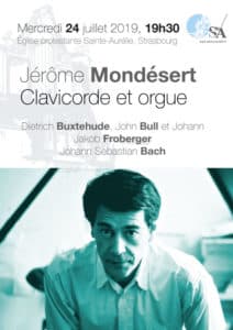 Mercredi 24 juillet, Jérôme Mondésert - clavicorde et orgue / 19 h 30 - entrée libre - plateauAu clavicorde sous la tribune avec des oeuvres de Dietrich Buxtehude, John Bull et Johann Jakob Froberger