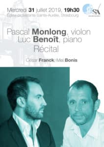 Mercredi 31 juillet 2019, Pascal Monlong - violon et Luc Benoît - piano / 19h30 - entrée libre - plateauLe programme est constitué de la fameuse Sonate pour violon et piano de César Franck accompagnée par une sonate de Mel Bonis, élève de Franck et des variations symphoniques pour piano de C.Franck.