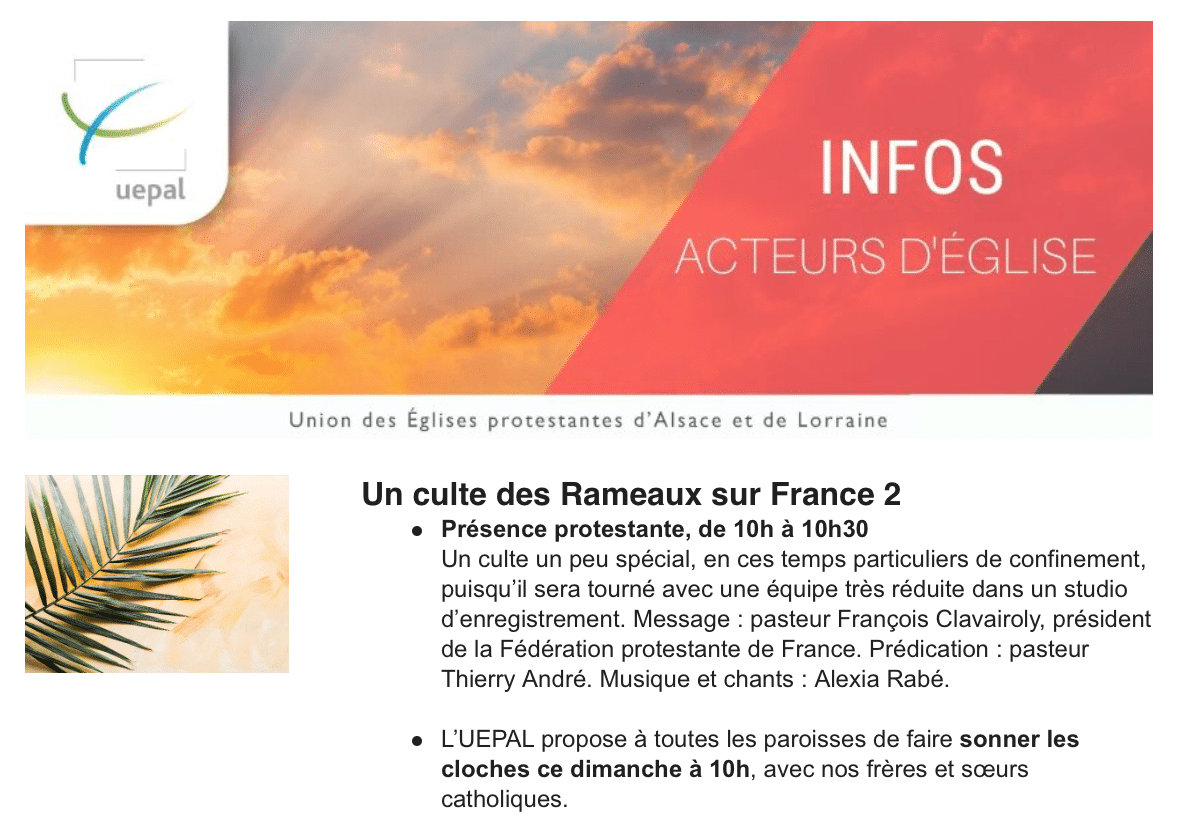 - Sur France 2 en replay : https://www.france.tv/france-2/presence-protestante/1351571-culte-des-rameaux-special-confinement.html