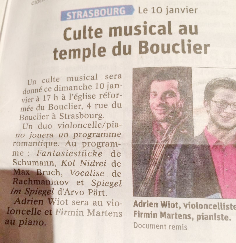 Culte musical dimanche 10 janvier à 16h00 (attention l’horaire dans les DNA est changé) au Bouclier. Le duo violoncelle/piano, Adrien Wiot et Firmin Martens jouera un programme romantique : Fantasiestücke de Schumann, Kol Nidrei de Max Bruch, Vocalise de Rachmaninov et Spiegel im Spiegel d’Arvo Pärt.