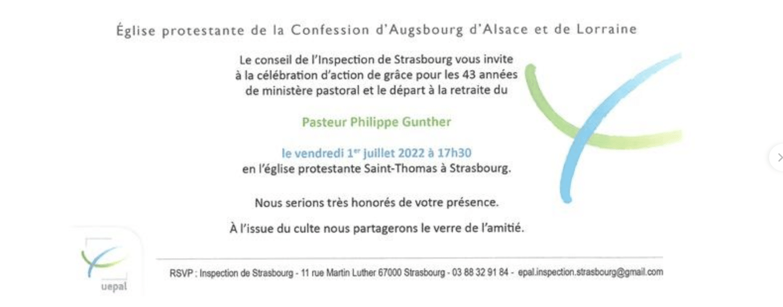 Départ à la retraite du Pasteur Philippe Gunther Vendredi 1er juillet, 17h30 à Saint-Thomas – rue Martin Luther, Strasbourg L’inspection ecclésiastique de Strasbourg centre vous invite au culte d’action de grâce pour le départ à la retraite du Pasteur Philippe Gunther.