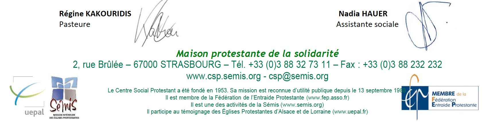 Pour le Nord et l’Ouest de Strasbourg : Paroisse Protestante Martin Bucer 7 Rue Gioberti, 67200 STRASBOURG – Lundi, mardi et jeudi de 9h à 12h + vendredi de 9h à 12h et de 15h à 18h.