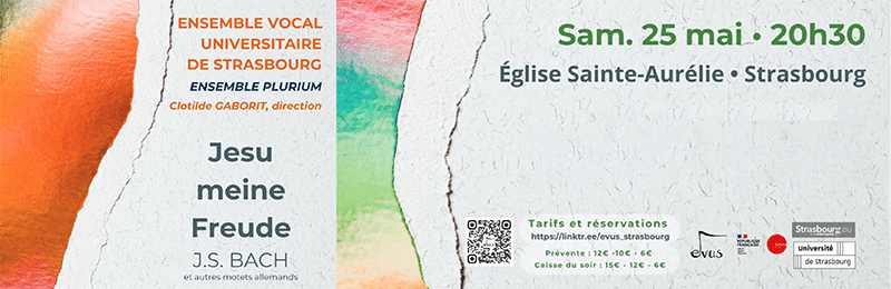 Samedi 25 mai, 20h30, OSA accueille l'EVUS (Ensemble Vocal Universitaire de Strasbourg) et l'Ensemble Plurium interprètera Jesus meine Freunde - et autres motets allemands de JS Bach.